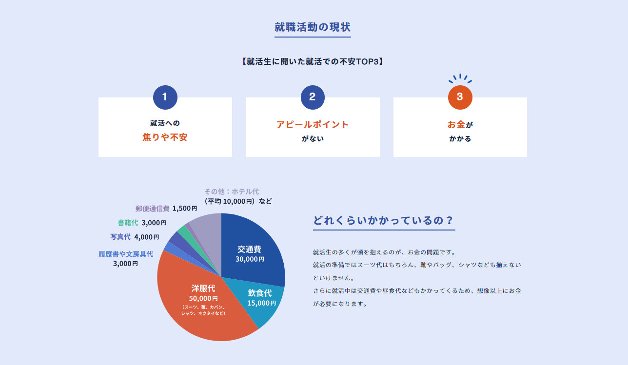 就職活動において、学生が抱える不安の一つに「お金がかかる」という課題があります。 就活生に聞いた不安TOP3の中でも、金銭的な負担は常に上位に挙げられており、リクルートスーツの購入費をはじめ、企業説明会や選考に伴う交通費、面接前後の飲食代など、就活準備の段階から多くの費用が発生しています。